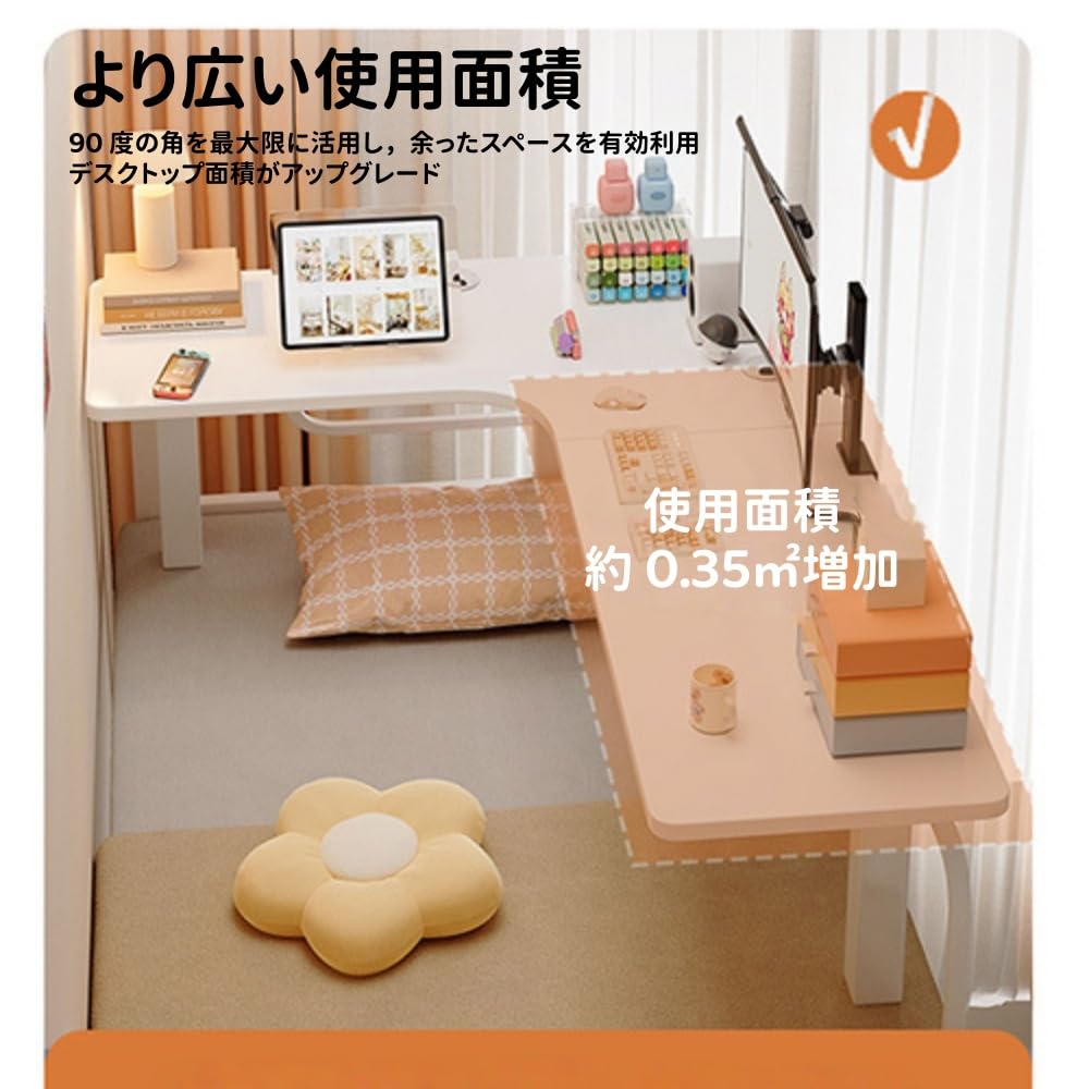 L 型デザインでスペースを最大活用 ベッド用デスクは L 型コーナー構造で 90 度空間を有効利用,約 0.35m の使用面積を追加。狭い学生寮でも PC書籍小物をまとめて置ける作業エリアを確保できます。