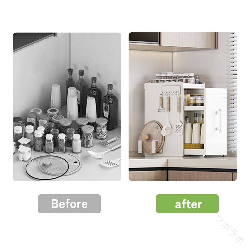 付属の引き出しは計量スプーンや個包装のスパイス、キッチンクリップなどの小物を収納でき、カウンター上の視覚的 clutter を軽減し、清潔で整然としたキッチン環境を実現します。さらに、引き出しにキャスターが装備されているため、調味料を大量に収納しても、引き出しの開閉がスムーズに行えます。