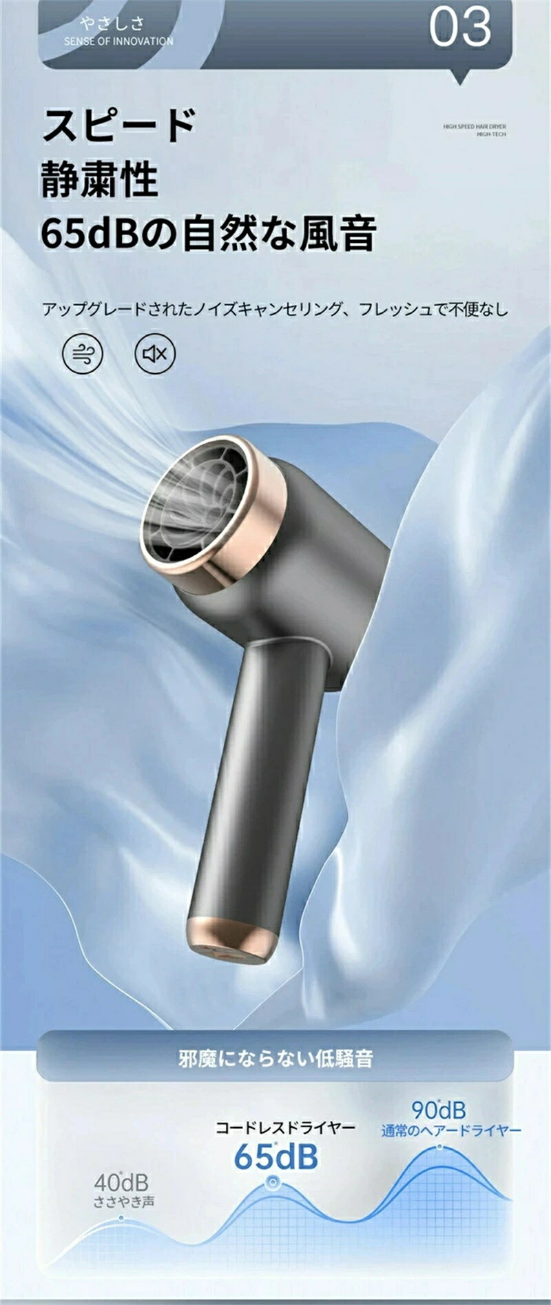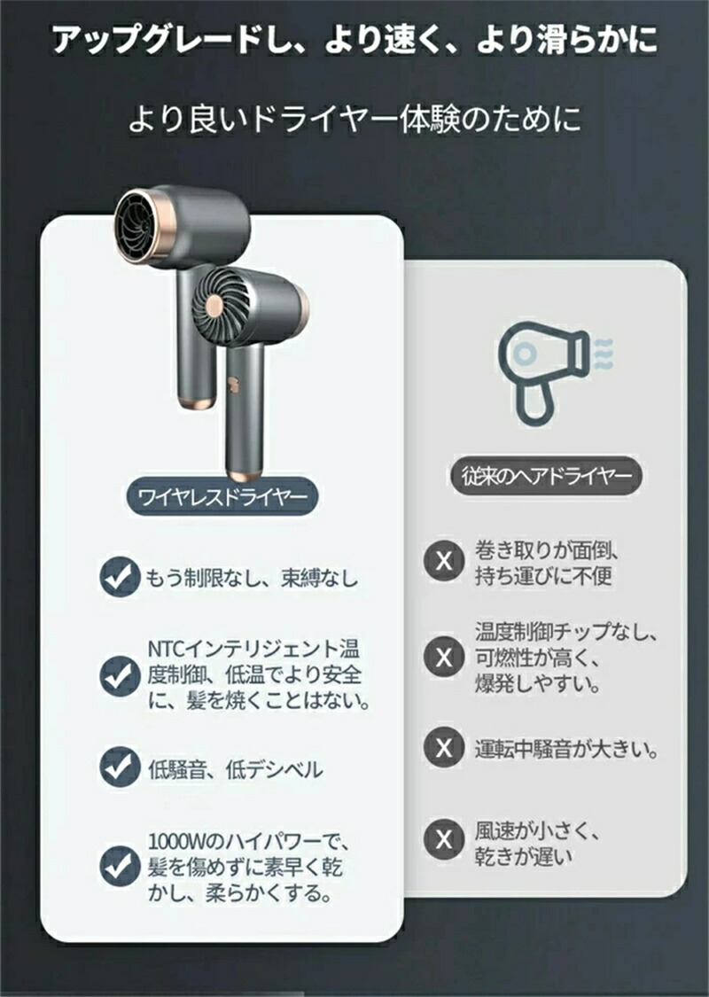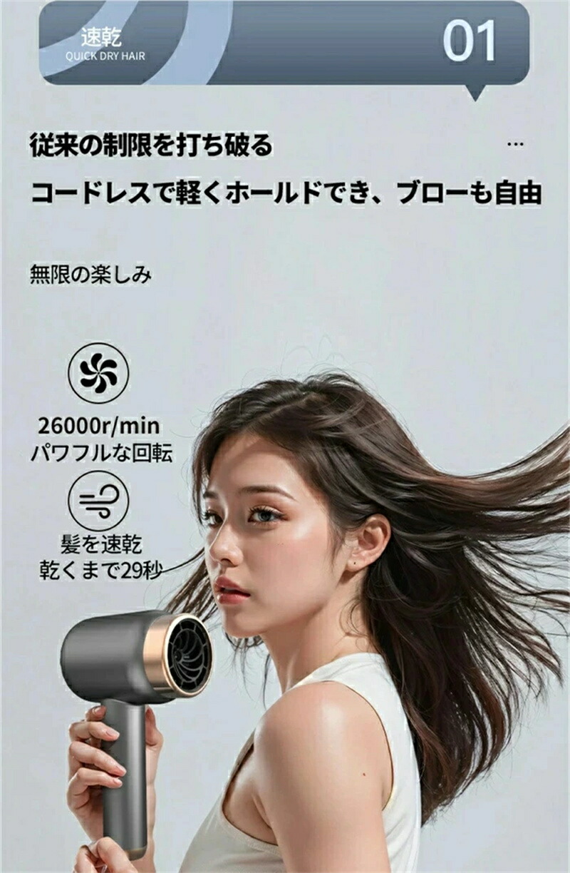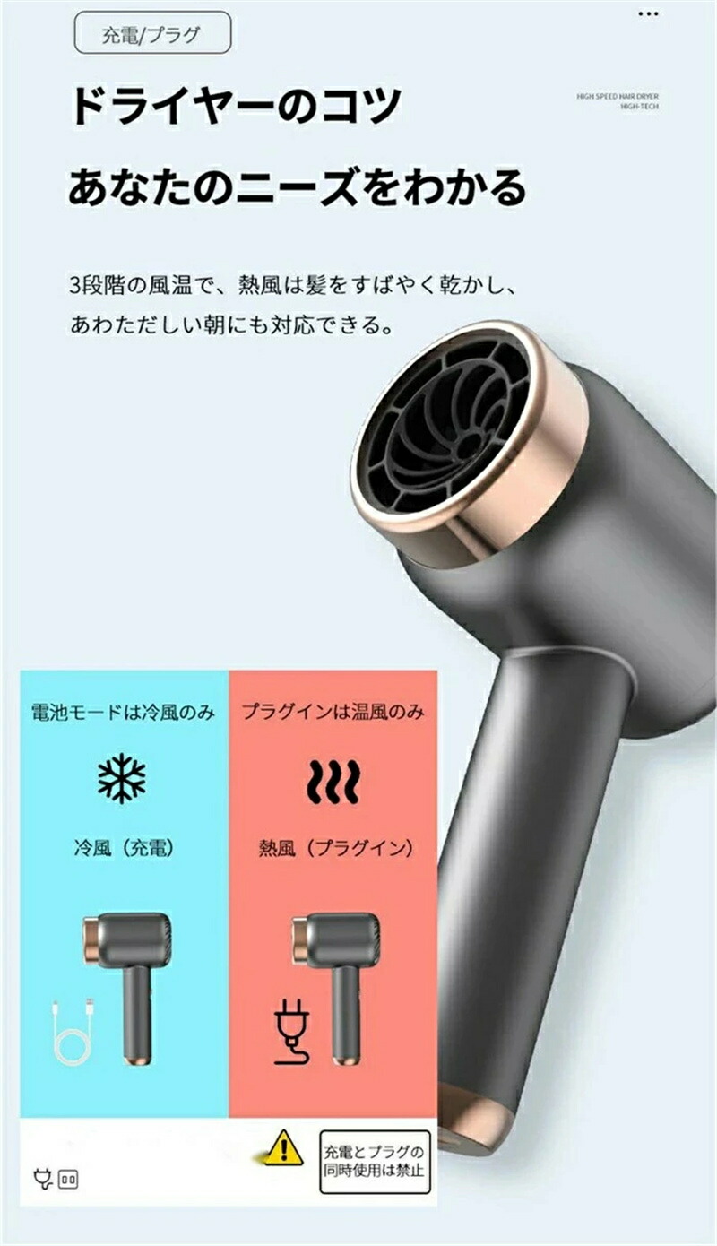 コードレス速乾充電式ヘアードライヤーコ グレー パープル ホワイト
