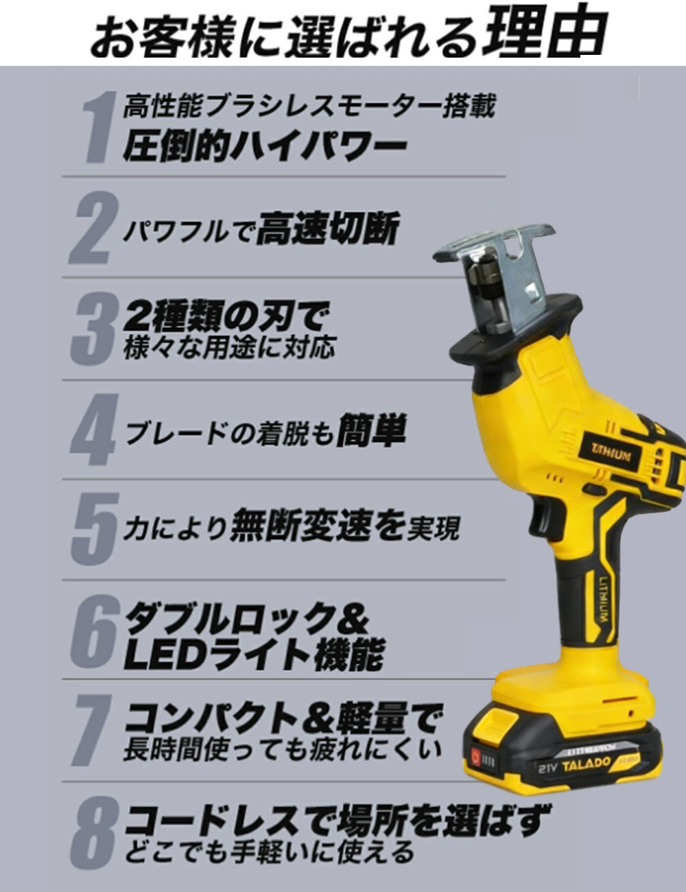 大きなゴミの解体、木材加工、ビニールパイプ、竹の切断、園芸のトリミング、低炭素鋼やアルミニウムの切断などに適しています。