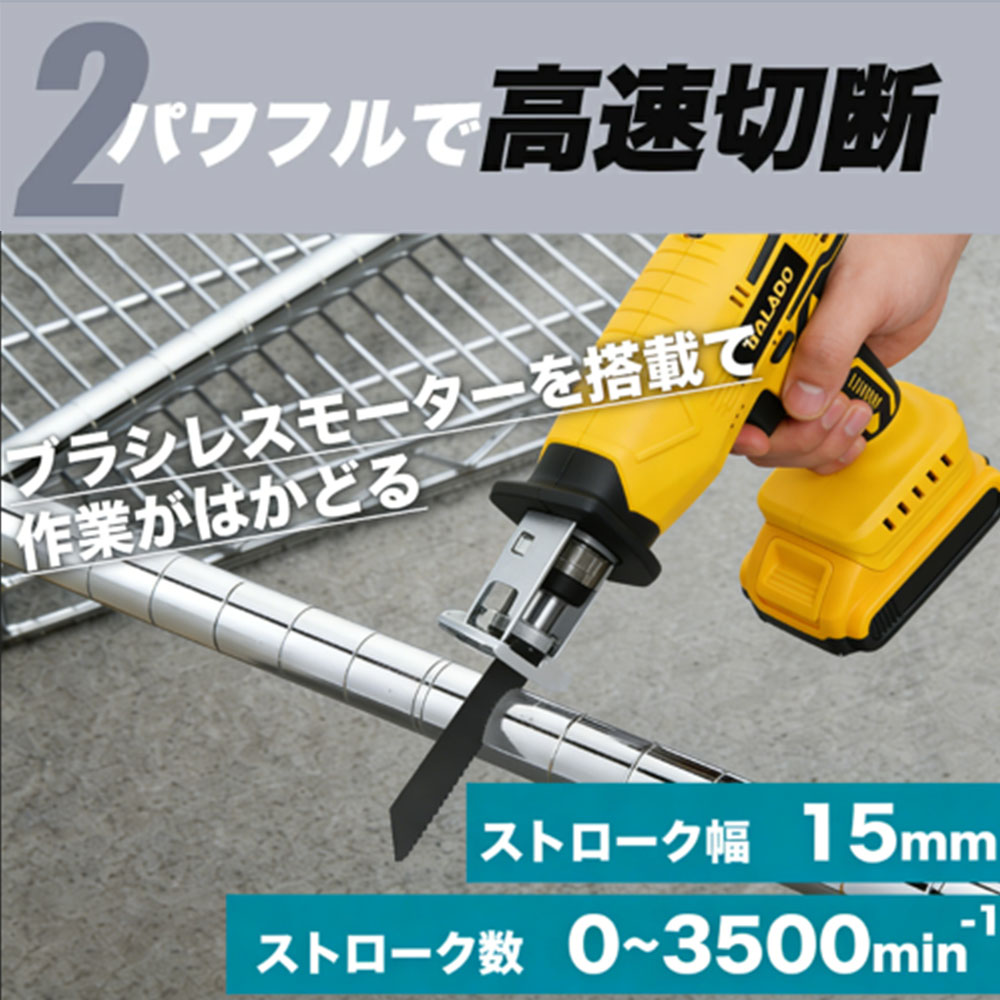コードレス往復鋸なので、狭い場所での作業や電力が必要な作業に使用できます。