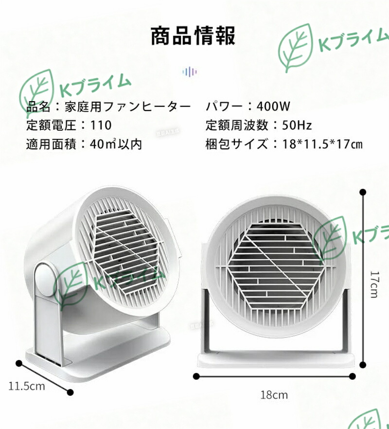 商品詳細【3秒の高速加熱、小型でも強力】脱衣所 ヒーター/電気ストーブ 小型/ファンヒーター 電気式/小型でも強力な高速加熱ヒーター、最大400W。 スイッチひとつで瞬時に温風が出る小型ヒーターです。 ミニのサイズは19 x 12 x 18 cmです。 一次暖房の補助として、足元やその他の限られたスペースを正確に暖めます。 トイレ、脱衣所、キッチンなど寒い場所にスポット暖房が最適!