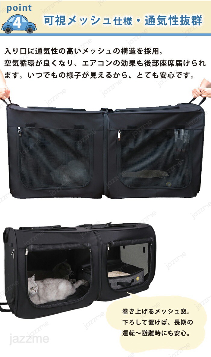 【可視メッシュ仕様・通気性抜群】天井と入り口の半分に通気性の高いメッシュの構造を採用。空気循環が良くなり、エアコンの効果も後部座席届けられます。いつでもの様子が見えるから、とても安心です。