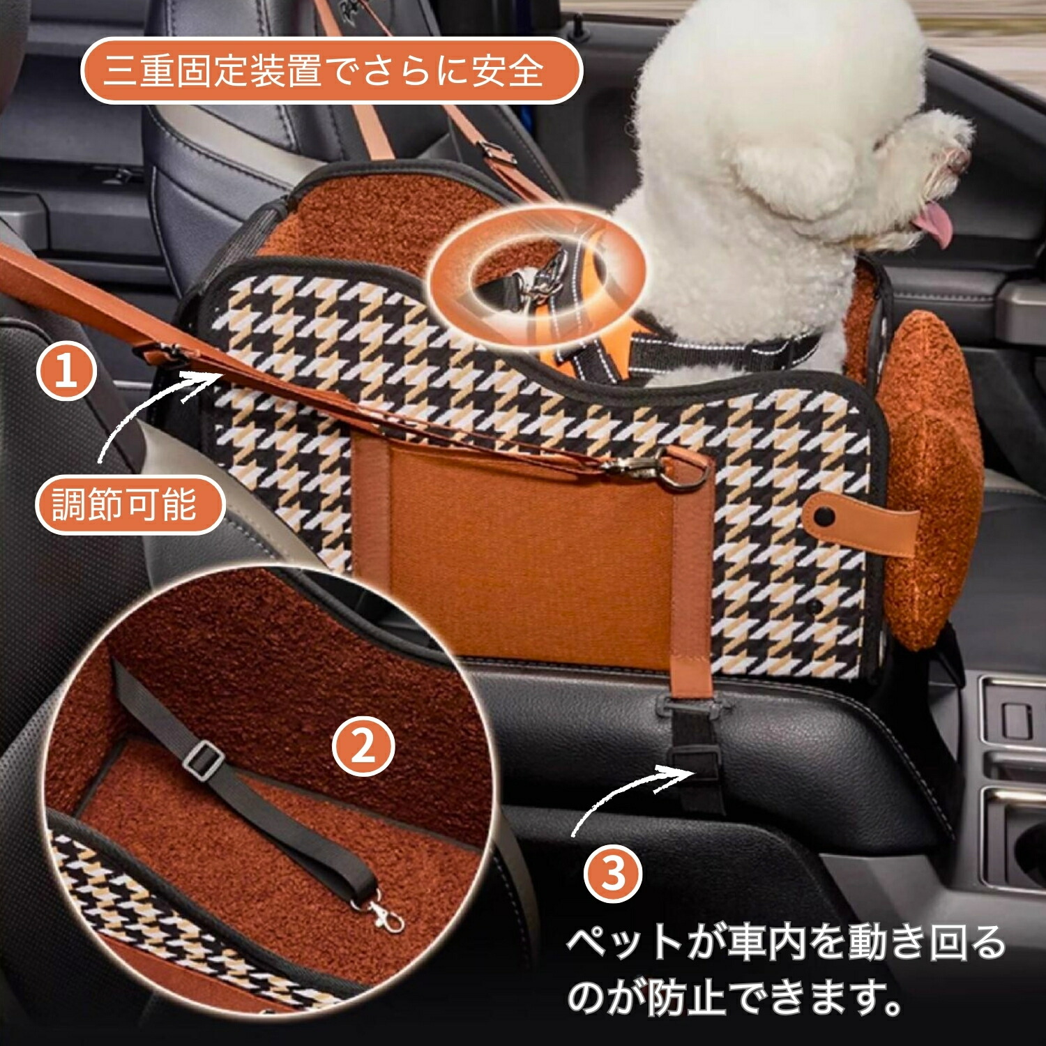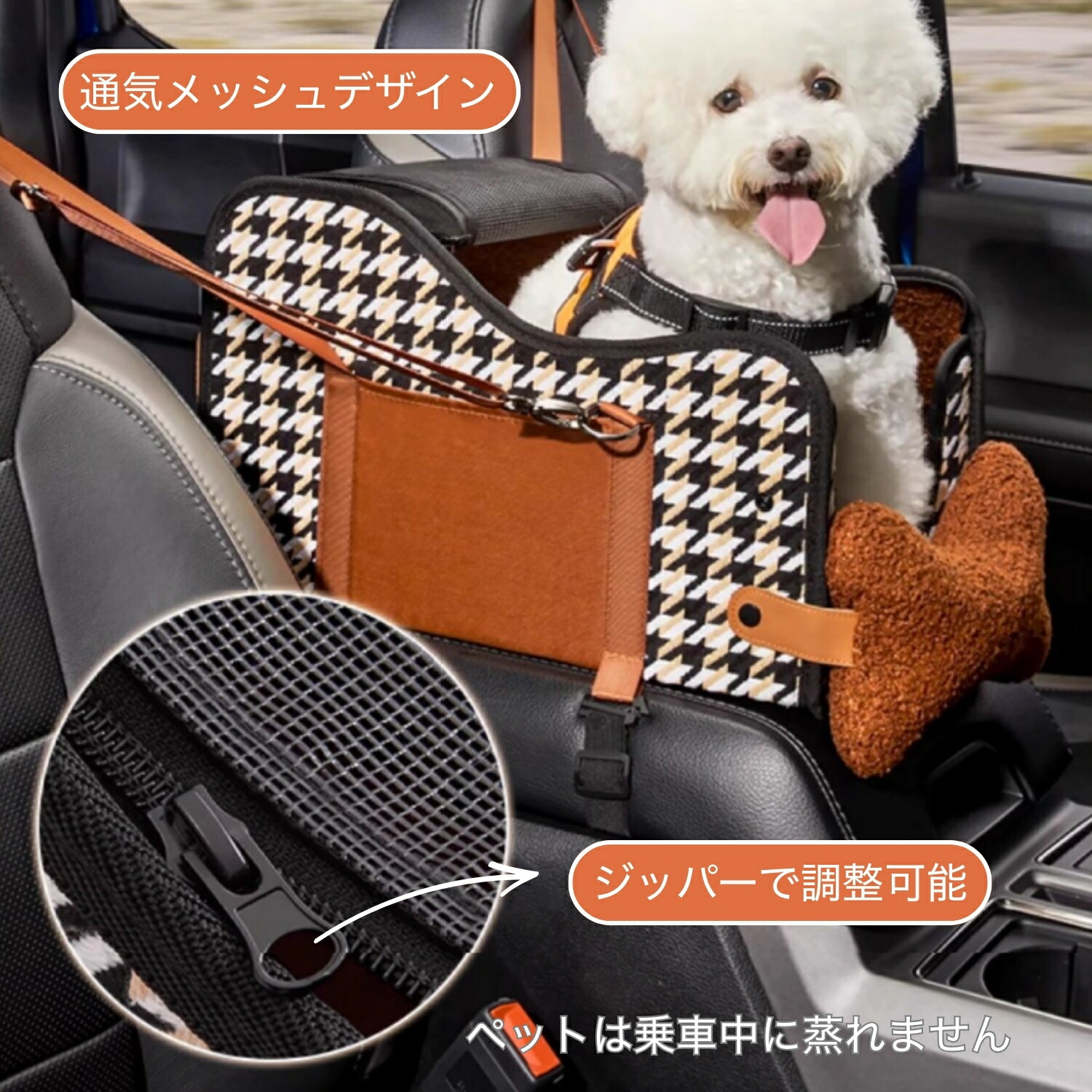 愛犬・愛猫との快適で安全なお出かけを実現する、多機能ドライブボックスです。車のセンターコンソール(アームレスト)部分に設置すれば、愛寵は自然と前方を向き、車内で安定。飛び出し防止用のリード(ハーネス接続可能)と、アームレストをしっかり捉える底面ロックロープによる二重保護設計で、急ブレーキや揺れの際も安心です。最大推奨体重7kgまで対応で、小型犬から猫まで幅広くご利用いただけます。