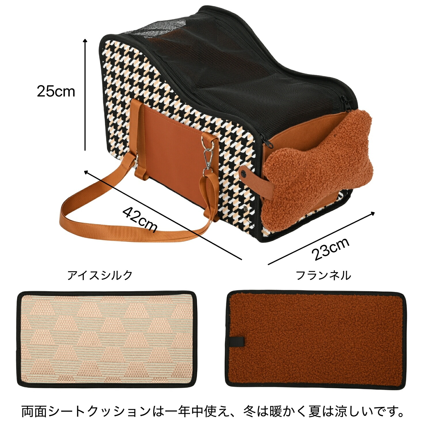 リバーシブル両面クッション:ふわふわ暖かい冬面と、さらり涼しい夏面の夏冬兼用仕様。春夏のお花見やアウトドアも快適。
