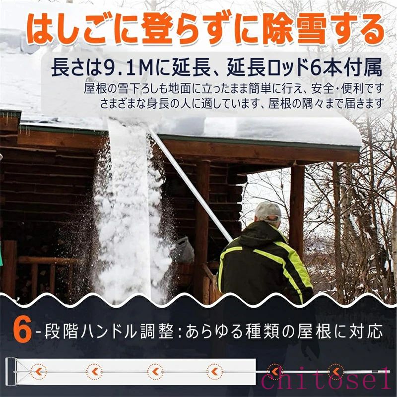 屋根雪下ろし棒 キャスター付き 雪降ろし棒 雪下ろし道具 スノーレーキ 雪落とし 屋根 スノーダンプ 屋根雪かき 全長約6-9m 5-6段階調整可能 アルミ 組立式 積雪 屋根を保護 時 屋根雪除去機