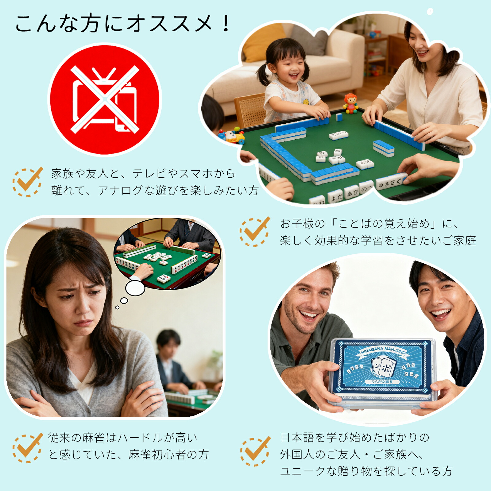 「子供と一緒に麻雀のようなゲームを楽しみたい」 → ひらがな表記に変更。