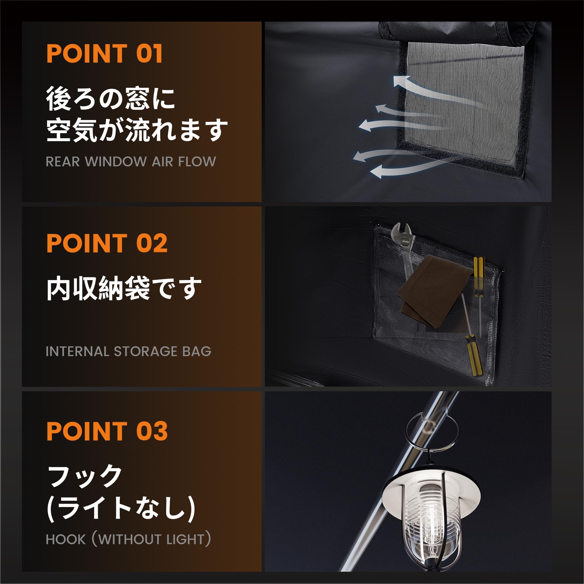 [付属部品]:カバーの後方には通気用の小さなメッシュウィンドウがあります。カバー内部には、日常的なツールやタオルを収納するための収納袋が含まれ、照明を吊るすための取り外し可能なフックも付いており、サイクルハウス内で愛車のメンテナンスや清掃を行う際に便利です。パッケージには手袋2組と1部の組み立て説明書が含まれています、組み立てが簡単に行えます。また、強化用のU型地釘、ロープ、L型地釘、弾力ロープも多数含まれています。