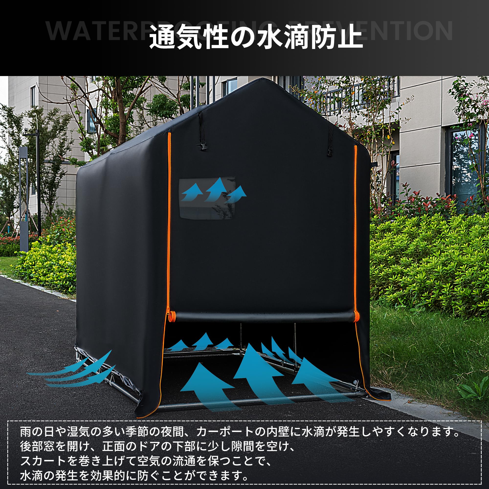 [防水防塵日よけ]:カバーには高密度のオックスフォード生地を使用し、内部にはPUコーティングが施されており、耐水圧は最大2,000mm、優れたUV防止効果を備えています。カバーの縫い目にはすべてシーリング加工が施されており、日光や雨水の浸入を減少させます。カバーの底部に延長されたスカートは、雨水や小動物の侵入を防ぎます。サイクルハウス、愛車を風雨、日光、埃から保護し、使用寿命を延ばします。