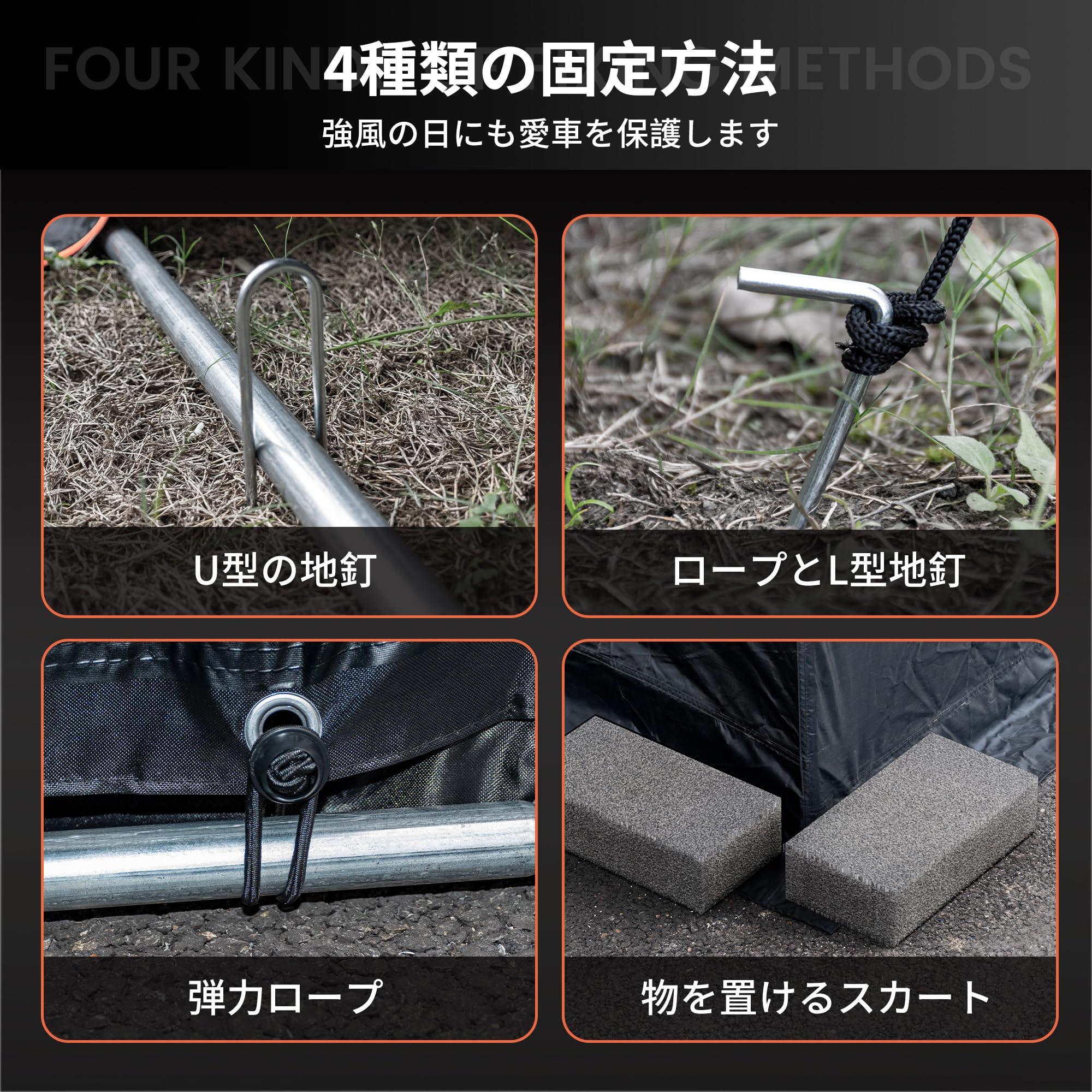 [全金属フレーム・防風]:サイクルハウスのフレームはすべて直径24mm、壁厚0.9mmの亜鉛メッキ鋼管で構成されており、プラスチック部品は一切ありません、構造が堅固で。4種類の固定方法が組み合わされています。U型の地釘が底部の鋼管を包み込んで地下に挿入され、ロープとL型地釘を組み合わせて自転車サイクルハウスをテントのように固定、弾力ロープが布カバーとフレームをしっかり結びつけ、布カバーの底部に延長されたスカートにはコンクリートブロックなどの重物を置くことができ、強風の日にも愛車を保護します。