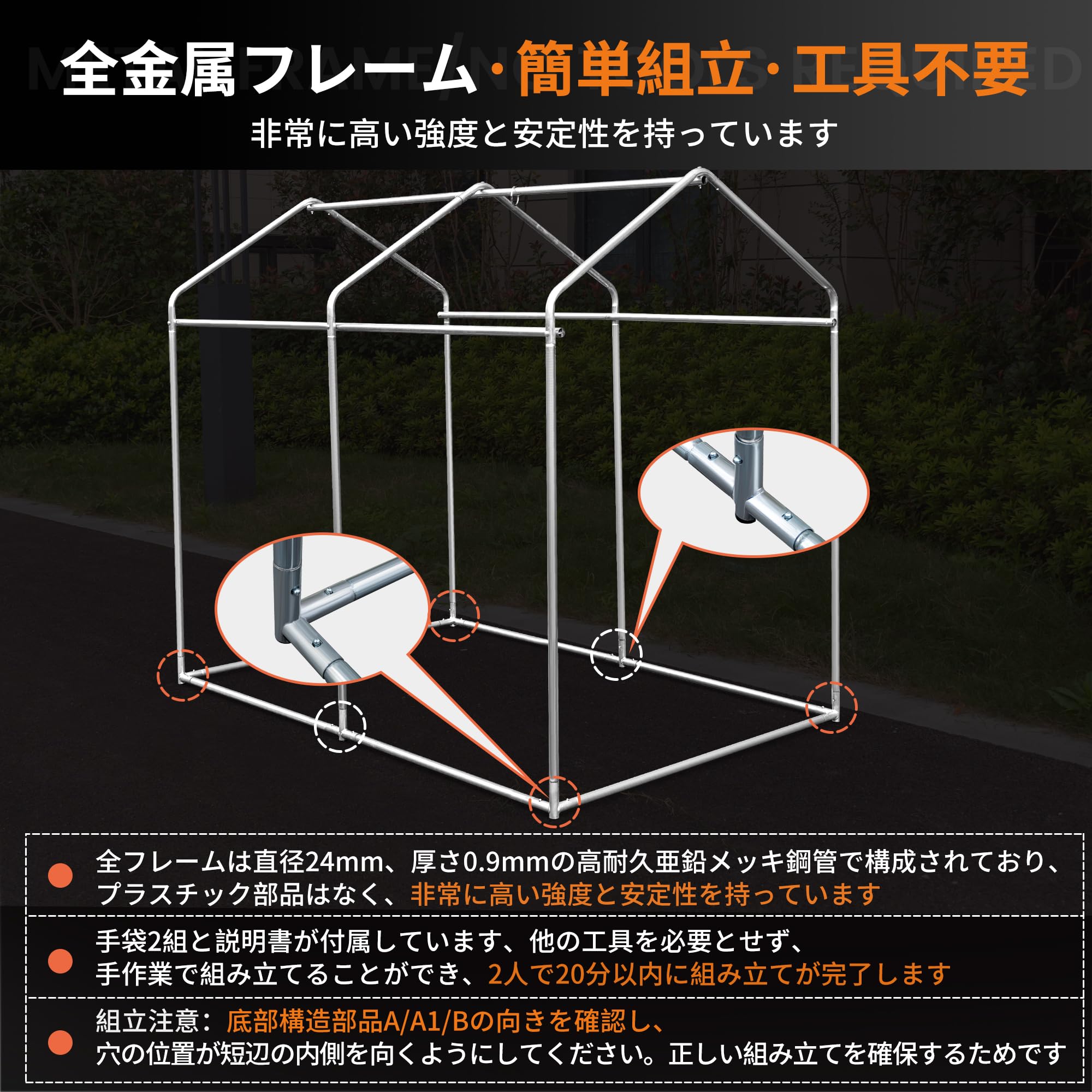 [簡単組立の工具不要]: 組立方法は、ジョイントにフレームを差し込み、ネジ留めするだけ。工具は必要ありません、手を動かすだけで30分程度でできる!(注1:鉄パイプには防錆油が塗ってあります。付属の手袋を着用して取り付けてください。注2:フレームのロックボタンとの穴が合わない場合は、説明書ステップ1の部品の向きが正確なのかをチェックして下さい、商品画像のフレーム図に記載されている組立注意の文字を参照してください。)