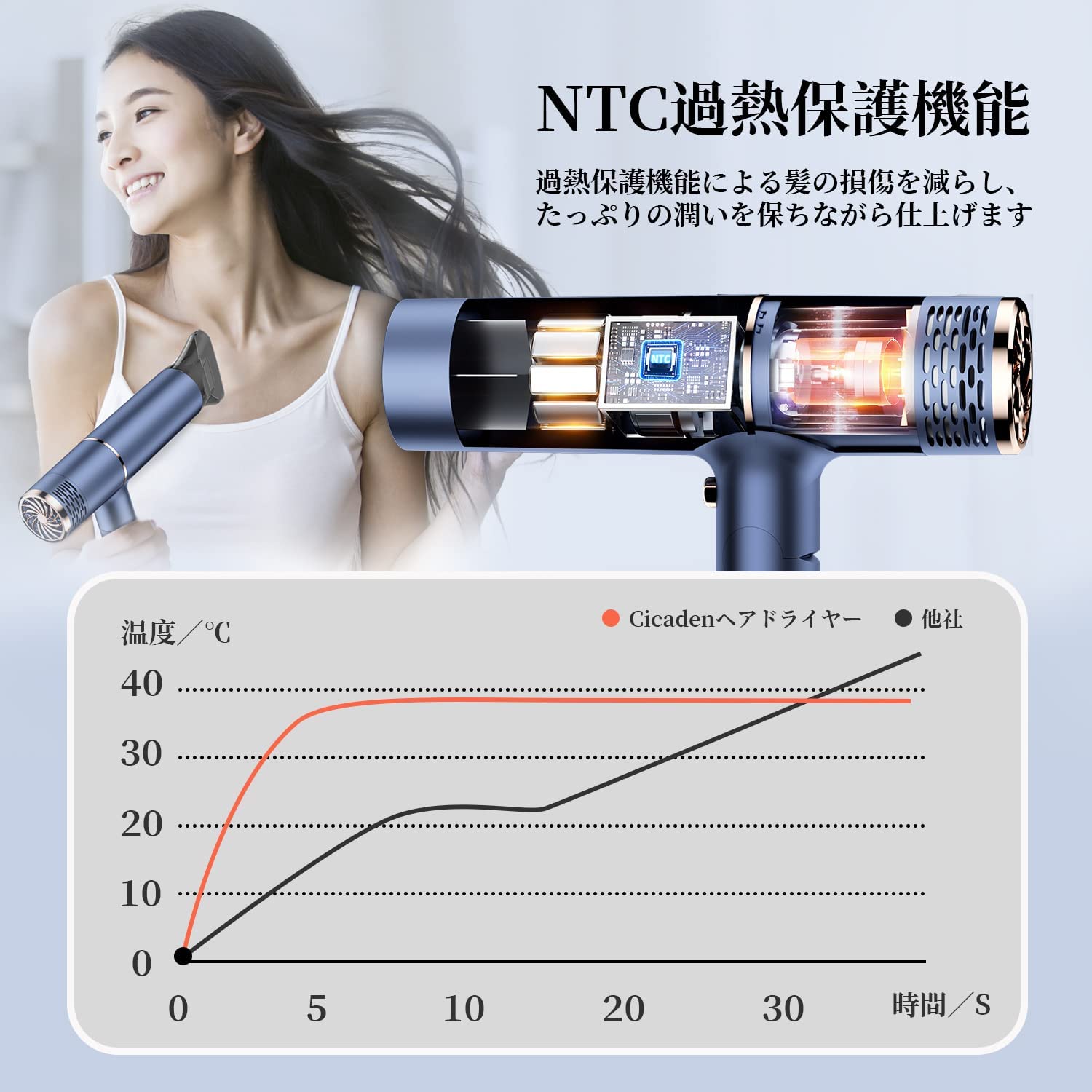 【2000万高濃度マイナスイオン】Cicadenヘアドライヤーは高濃度マイナスイオン低騒音技術を採用し、吹き出し口からは2000万個以上のイオンが放出され、空気中の酸素分子を取り込んで高密度のマイナスイオンを発生します。 髪に潤いを与えて、髪の毛を優しいケア、静電気の発生を最小限に抑え、乾燥した髪を改善してツヤにアップできます。 火傷を防ぐため、使用中はノズルに触れないでください。