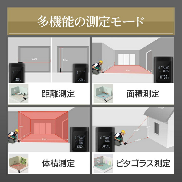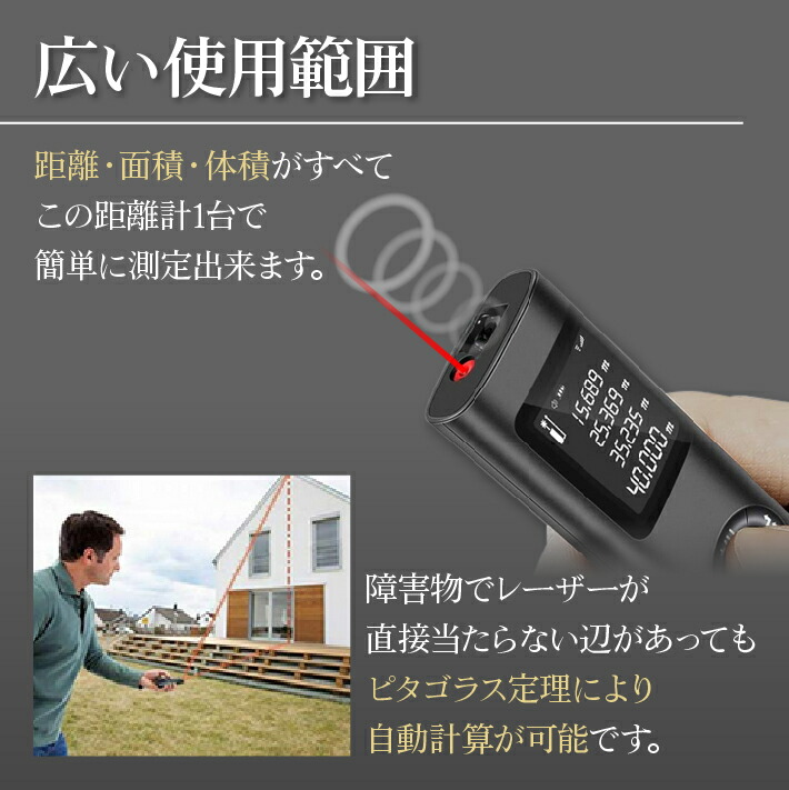 距離や面積、体積がすべて距離計1台で簡単に測定!また、障害物で光が直接当たらない辺があっても、ピタゴラス定理により自動計算が可能です。家庭内DIY 使用だけではなく、建築工事作業現場、不動産屋用、引っ越し用、行政書士の土地建物調査の測定作業にも最適で活用しています。