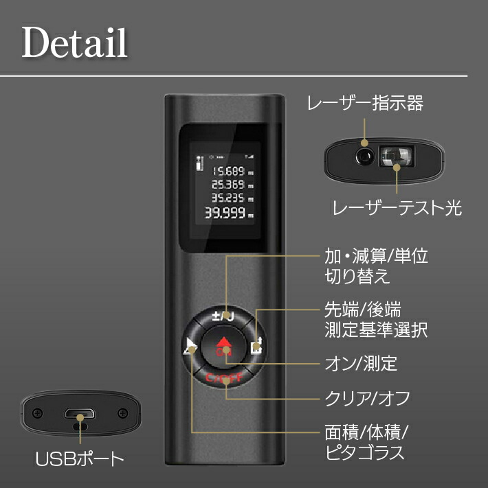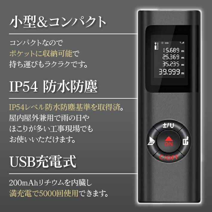 距離計 最大40m測定 距離 面積 容積 ピタゴラスなど測定可能 携帯型 距離計測 高精度 距離測定器 小型 距離計測器 コンパクト デジタル画面 USB充電式 日本語取説付き 小型距離測定器