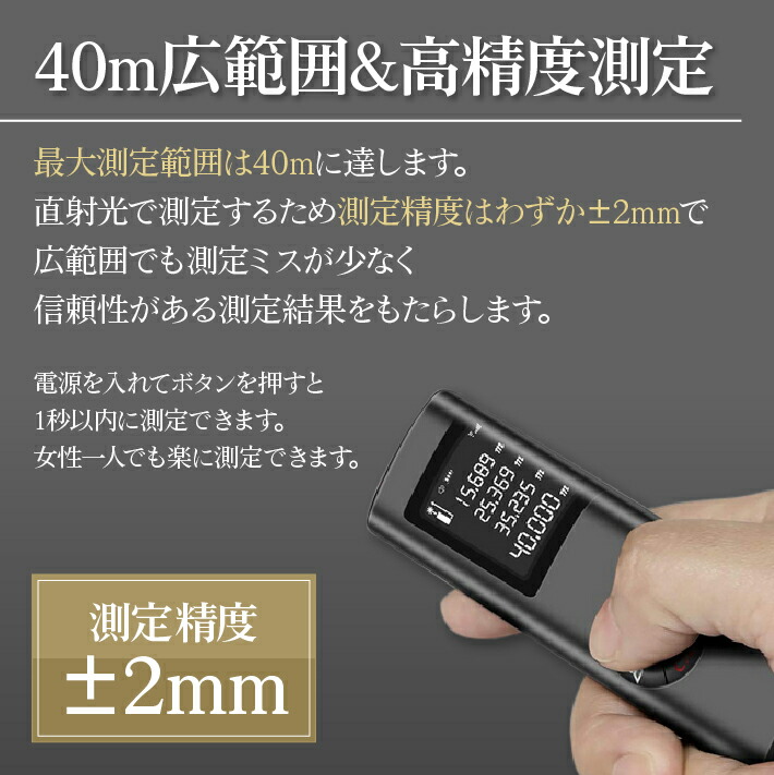 最大測定範囲40mに達します!直射光で測定するため、測定精度はわずかプラスマイナス2mmので、広範囲でも、測定ミスが少なく、信頼性がある測定結果をもらえます。様々なシーンに使用する充分です!電源を入れて、ボタンを押すと1秒以内に測定できます。女性一人でも楽に測定できます。