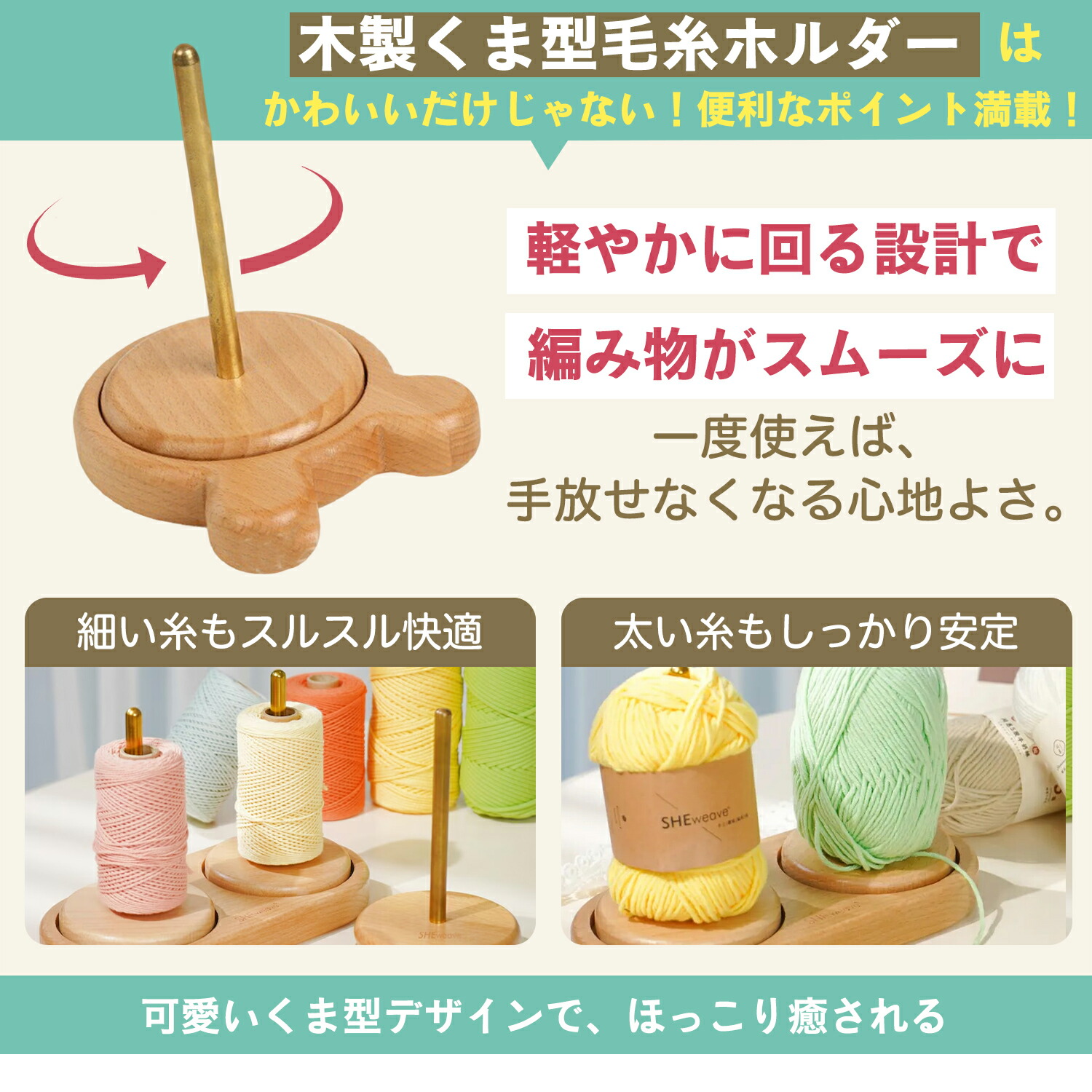 ヤーンホルダー 回転 編み物 ヤーンスタンド 回転式 木製 毛糸ホルダー 木製ラック 織物ツール 使いやすい 毛糸 毛糸玉 整理 収納 丸型 スタンド 裁縫 木製ヤーンホルダー 熊型
