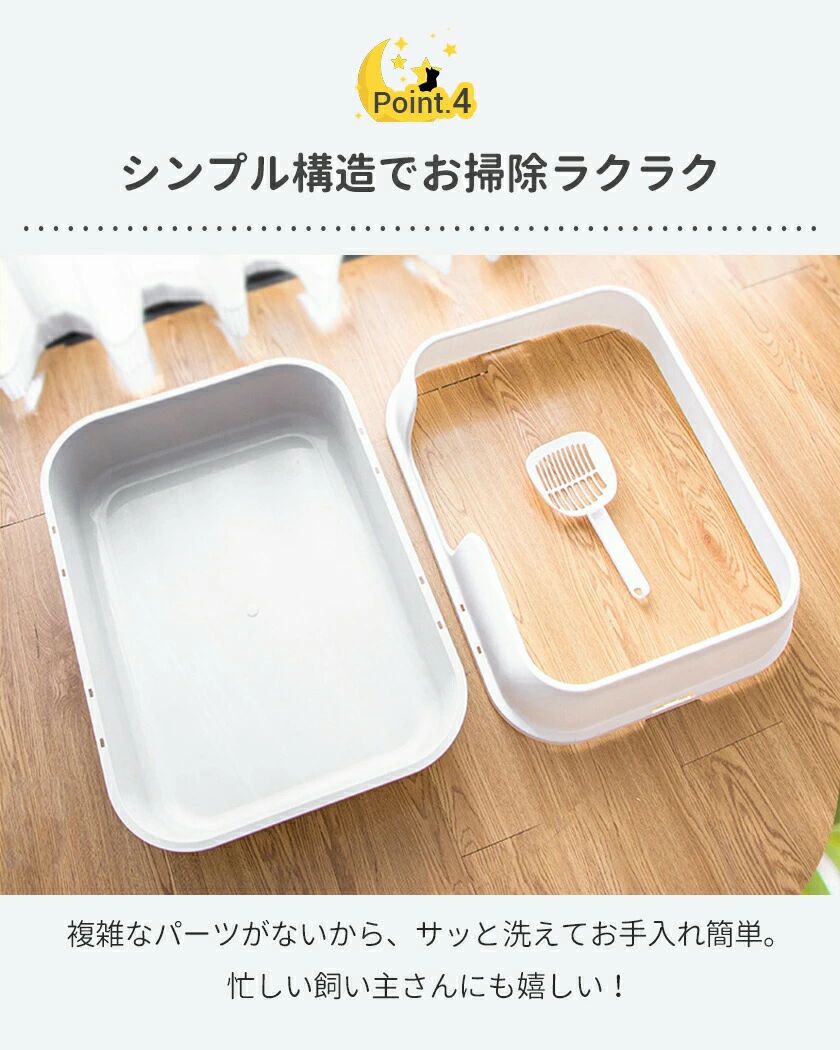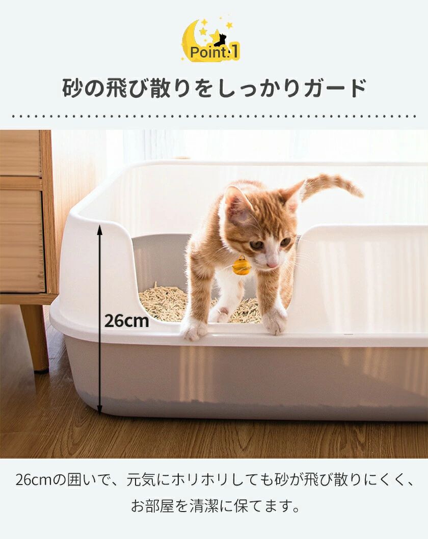 【2】高さ26cmの飛び散り防止ガード付きで、砂の飛散をしっかりブロック。お部屋の清潔もキープ。