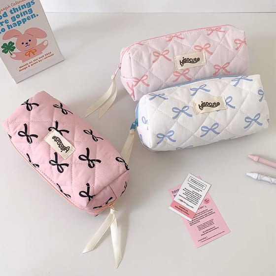 ペンケース ポーチ 筆箱 大容量 軽い 持ち運び 女の子 かわいい ガーリー 小学生 中学生 高校生 大学生 文房具 リボン柄 キルティング 刺繍 ポリエステル ブラック ブルー ホワイト 多 ピンク