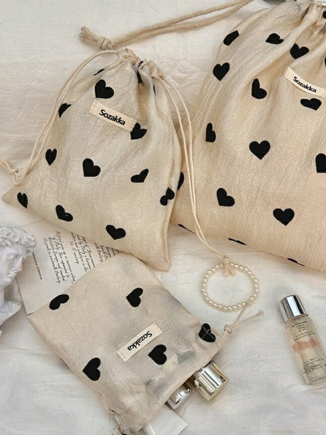 ポーチ3点セット ハートドット柄 光沢 巾着ポーチ メイクポーチ 小物収納 可愛いバッグ コスメポーチ 旅行 コンパクト 収納バッグ 化粧ポーチ