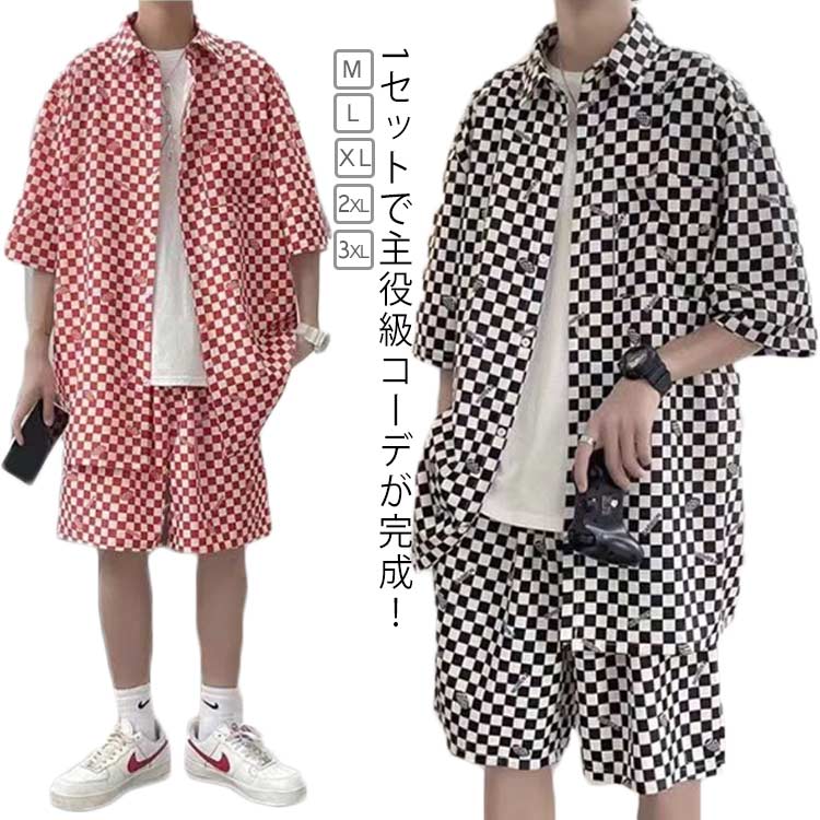 夏 シャツ ゆったり 半袖 2点セット ショートパンツ 柄シャツ 大きいサイズ チェッカーフラッグ柄 総柄シャツ アロハシャツ セットアップ 海 川 夏休み ハーフパンツ カジ リゾート