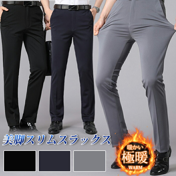 スラックス メンズ 冬用 裏起毛 暖 パンツ ビジネスパンツ ストレート 伸びる あったか 紳士 ズボン 洗える ウォッシャブル 細身 美脚 スリム ゴルフパンツ 通勤 仕事 冬服 黒 紺