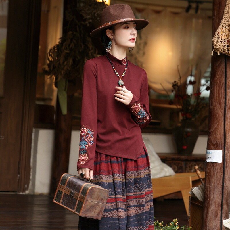 レディース Tシャツ カットソー 刺繍 エスニック ハイネック タートルネック ボトルネック 長袖 ボルドー ブラック M-2XL きれいめ