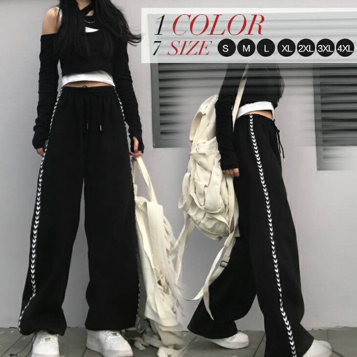 7サイズ 1カラー サイドラインパンツ ボトム ワイドパンツ スウェットパンツ ハーレムパンツ風 裾 ゴム入り 絞れる ブラック ダンス 練習着 大きいサイズ ウエスト ゴム レディース
