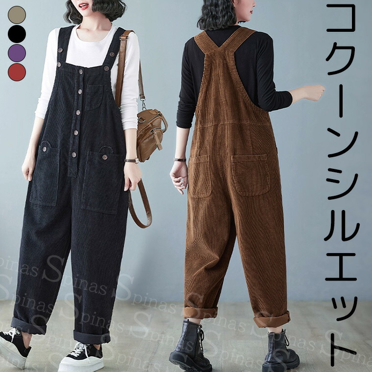 あったか素材 お洒落オーバーオール 30代 40代 50代 コーデュロイ レディース つなぎ コクーンパンツ セミワイドパンツ オールインワン ジャンプスーツ ボタン グリーン ブラック サロ カーキ