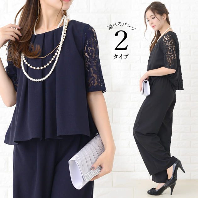 パーティードレス パンツドレス 選べる2タイプ ワイドパンツ テーパードパンツ セットアップ 上下セット 5分袖 花柄レース レディース フォーマル 上品 お呼ばれ 入園式 入学式 大きいサイ 結婚式