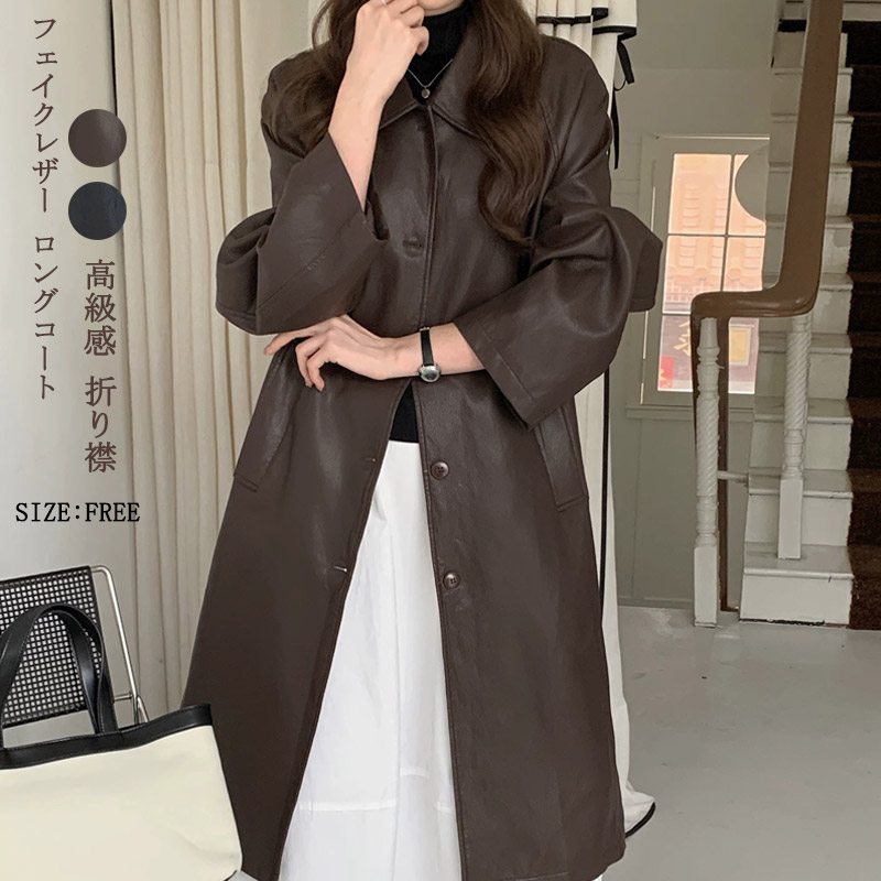 フェイクレザー ロングコート PU レザージャケット レディース 冬 アウター 合皮 ロング丈 ジャケット 革ジャン 折り襟 ロングジャケット 長袖 ベルト付き エコレザー 合成革 ビ トレンチコート
