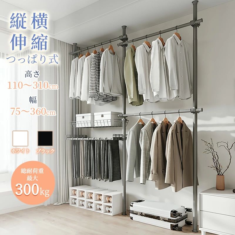 つっぱり式ハンガーラック 2段 3段 4段 伸縮 高さ 110-310cm 幅 75-360cm 突っ張り スリム 省スペース おしゃれ インテリア コンパクト