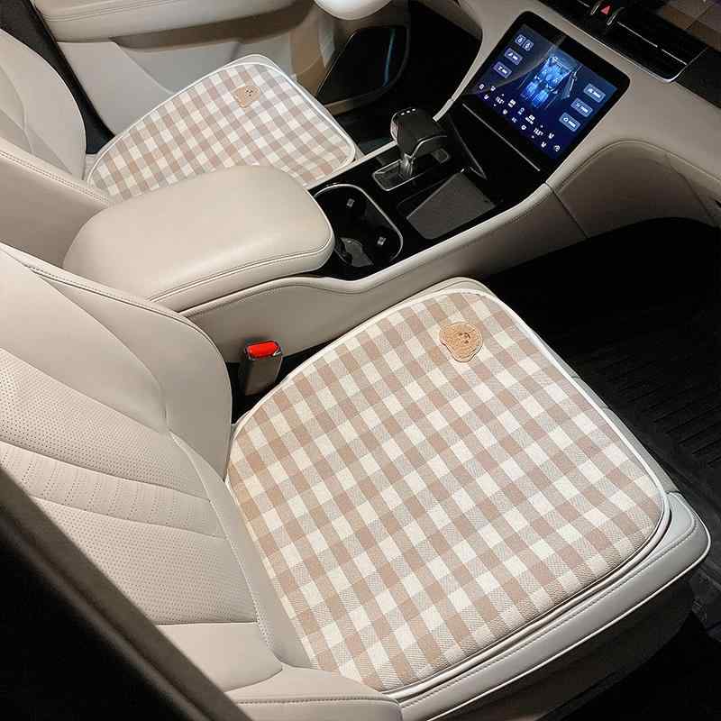 車 クッション シート カバー リネン 座席 フロント リア 座面 背もたれ 装飾 カー用品 アクセサリー 通気性 シンプル 茶 クマ チェック柄 かわいい