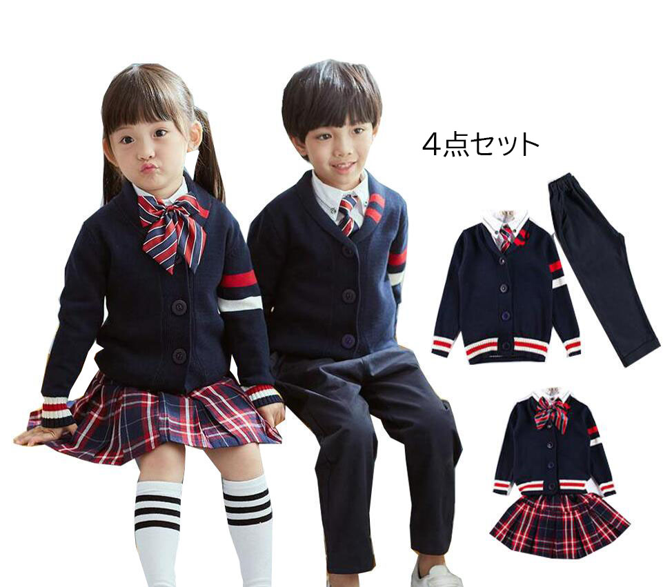 子供イギリス風4点セットアップ 秋冬 ニットジャケット 幼稚園小中生制服 セーター 団体服 リボン 長袖 チェック柄 フォーマル 男の子女の子ジュニアスーツ 入学式