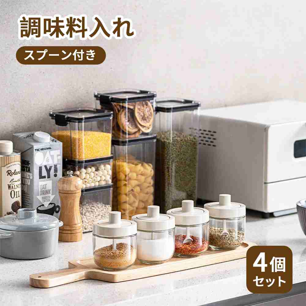 調味料入れ ガラス 調味料ポット 4個セット スプーン付き 300ml 砂糖 耐熱ガラス 調味料ボトル 調味料ケース スパイスジャー スパイスボトル 調味料缶 調味料ストッカー 湿気防止 調 高気密性