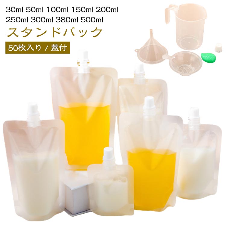パウチ ふた付 50枚入り スパウトパウチ 透明 30ml 50ml 100ml 150ml 200ml 250ml 300ml 380ml 500ml 液体容器 注ぎ口付きパック ド スタンドパック