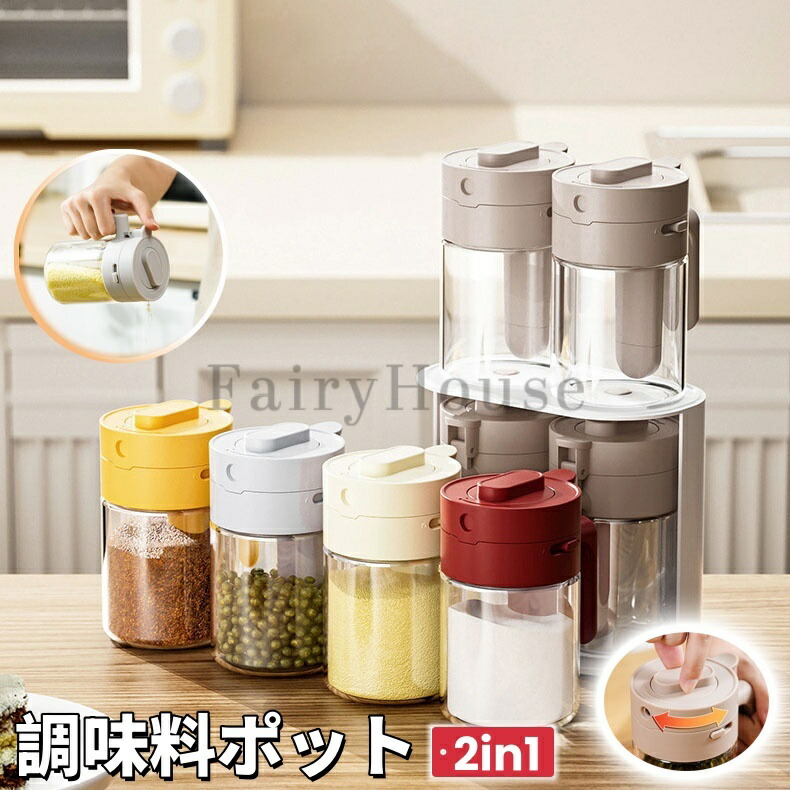 調味料入れ 調味料ポット スプーン付き 2in1 調味料ふり 調味料ボトル 調味缶 スパイスボトル 塩 コショウ 砂糖入れ 粉ふり機能 耐熱ガラス 湿気防止 洗いやすい 300m 大容量
