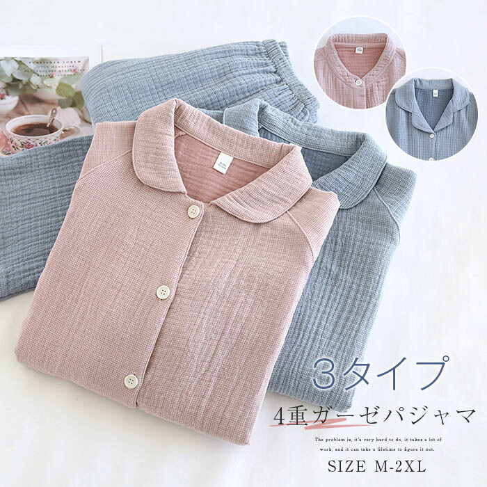 4重ガーゼ パジャマ レディース ルームウェア ガーゼパジャマ 厚手 ガーゼ 長袖 コットンパジャマ 無地 部屋着 セットアップ 2点セット ロング丈パンツ 寝間着