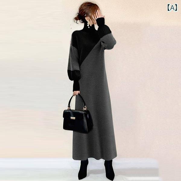 エレガント 特徴的 人気 黒ワンピース レディース 体系カバー 秋 冬 ファッション ミディ丈 長袖 ニットドレス 二色使い ツートン ハイウエスト スリムフィット おしゃれ 上品 エレガ かわいい