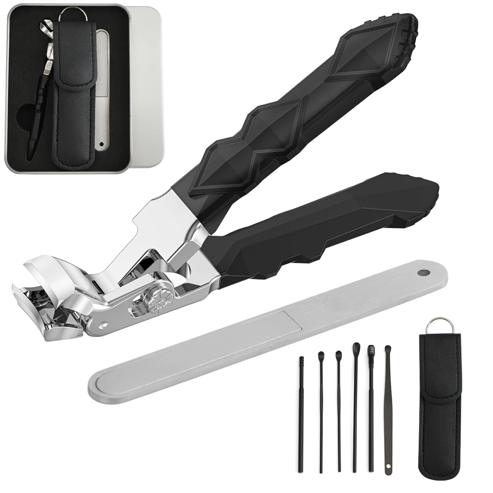 ネイルクリッパー 高齢者向け角度付きヘッドネイルクリッパー ワイドジョーオープニング 爪カッター キャッチャー付き ボックスと耳摘みセ ロングハンドル