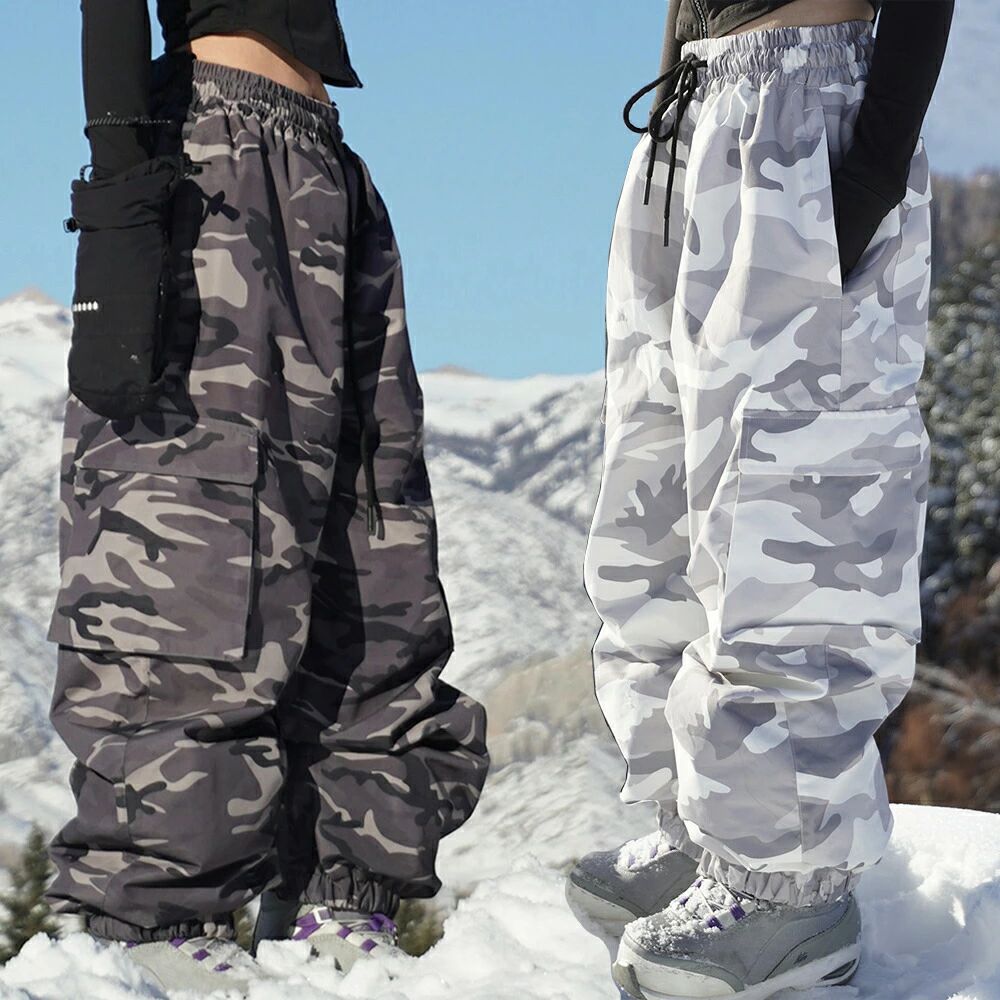 男女兼用のスノーボードやスキーに最適なゆったりビッグシルエットパンツで迷彩柄や豹柄無地の豊富なカラーバリエーション