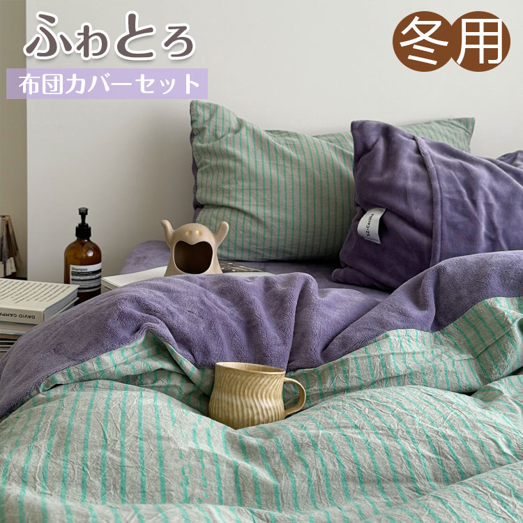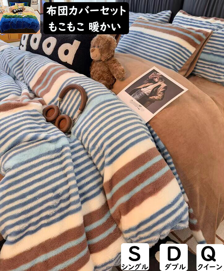 布団カバーセット ストライプ 北欧 秋冬 厚手 フェイクファー ふわふわ 暖かい フランネル シングル ダブル クイーン 掛け布団カバー ボックスシーツ 枕カバー 3点4点セット 寝具 フラットシーツ