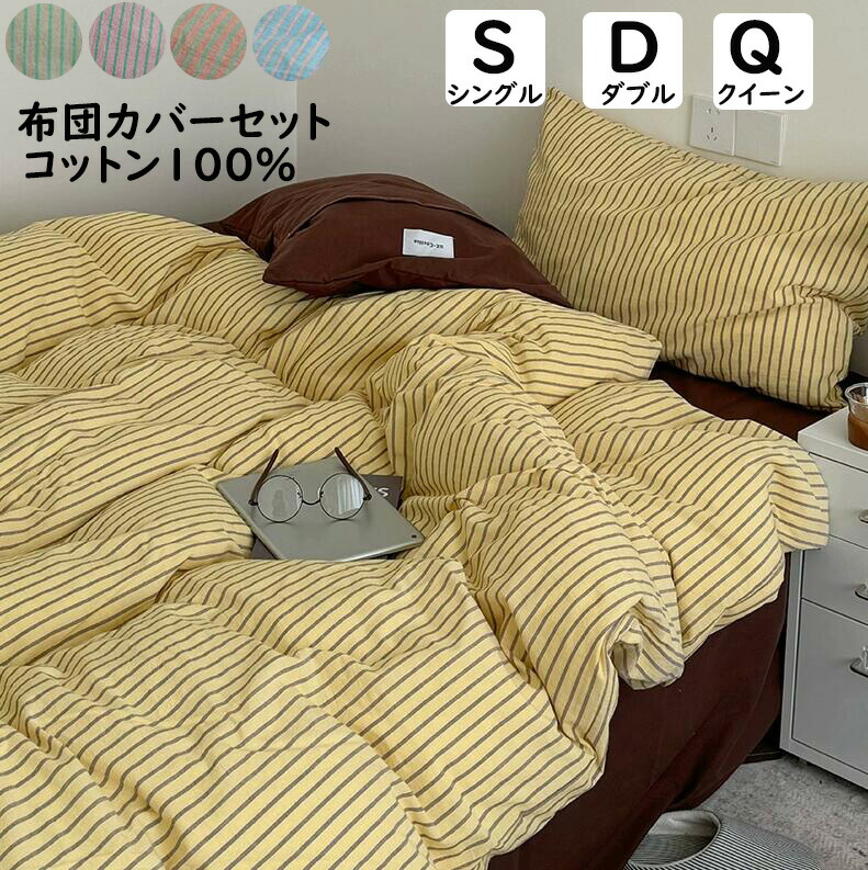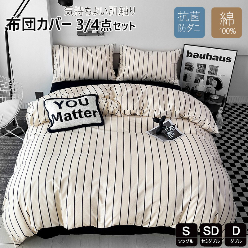 布団カバーセット 掛ふとんカバー3点セット 4点セット ストライプ柄 北欧 シングル ダブル クイーン ins風 綿100% 優しい肌触り ボックスシーツ 掛け布団カバー 枕カバー 寝 フラットシーツ