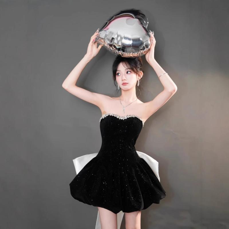 ワンピース レディース ベアトップ リボン ベロア パーティードレス ミニ丈 ノースリーブ スクエアネック かわいい スイート エレガント 上品 プリンセスライン 結婚式 二次会 お呼ばれ フォーマル