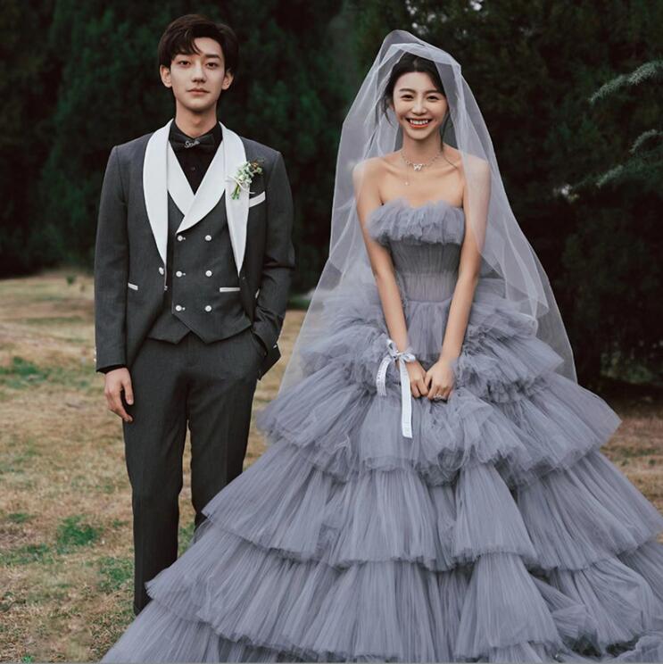 ウェディングドレス 花嫁ドレス カラードレス グレー オフショルダー 高級感 多重チュール 前撮り 演奏会 プリンセスドレス お姫様 結婚式 ロング きれいめ パーティードレス フォトウェディング撮影