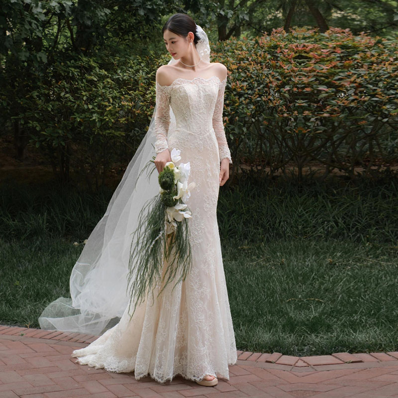 ウェディングドレス ウエディングドレス 付け袖 二次会 結婚式 披露宴 前撮り レースの長袖ドレス ロングドレス 花嫁 Aラインドレス レース 海外挙式 フォトウェディング オフホワイ オフショルダー