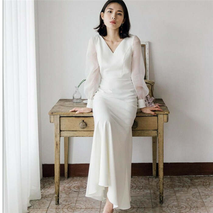 ウェディングドレス お花嫁ドレス 長袖 サテン スレンダードレス 白ワンピース シンプル ロングドレス 高級感 前撮り 後撮り 結婚式 挙式 パーティードレス ブライダル お洒落 披露宴 二次会 礼服