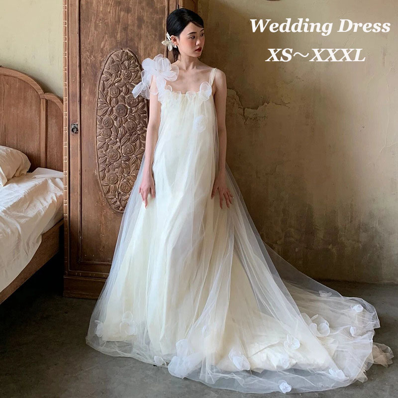 ウェディングドレス 花びら 森ガール系 ゆったり 演奏会ドレス キャミソールドレス トレーン 結婚式 前撮り 後撮り 白ドレス ふわふわ 可愛い パーティードレス イブイングドレス 挙式 お花嫁ドレス