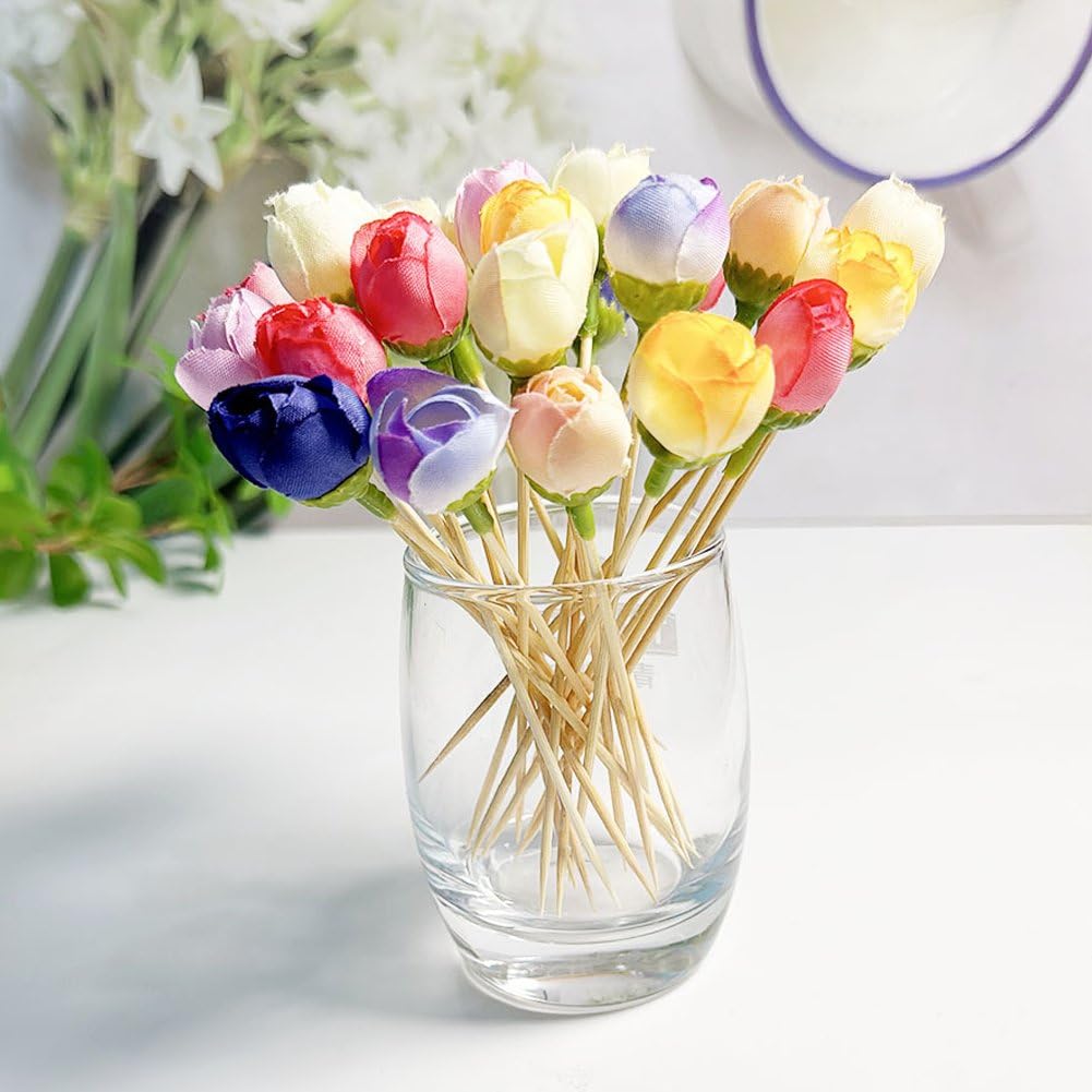 カクテルピック カクテルスティック 造花 ローズブッド フルーツピック 挿入式 デザート デコレーション 木製串 パーティー用 トレイ用 50個入り フルーツプレート用