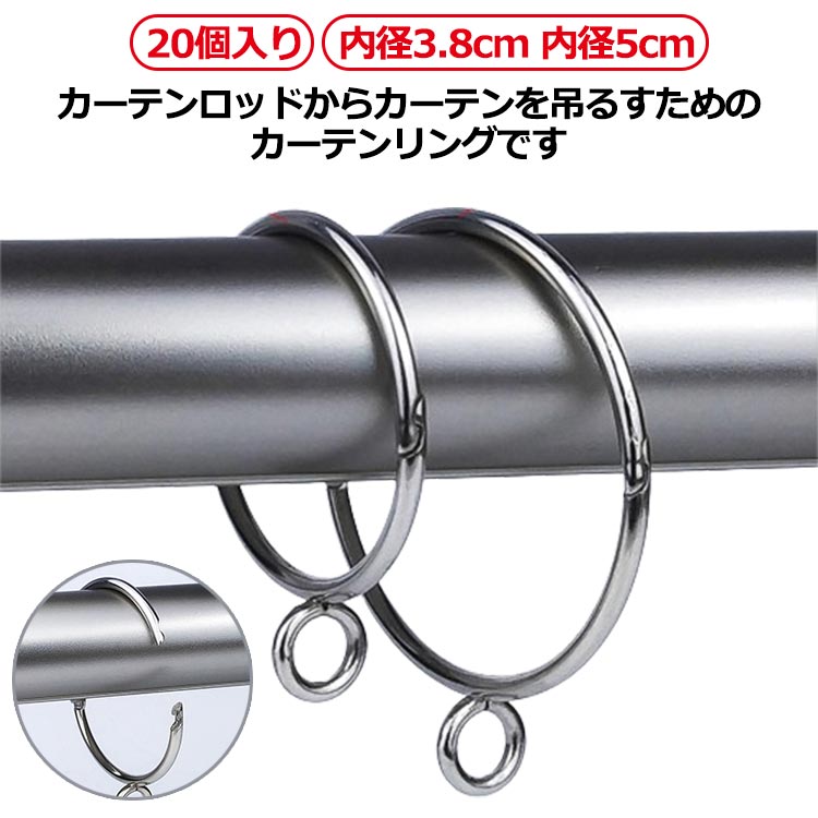 20個入り カーテンリングフック 固定 内径3.8cm 内径5cm 開口設計 シャワーカーテンリング しっかり カフェカーテン カーテンフック 金属製 防錆 ドレープリング スライドリング 簡単取付