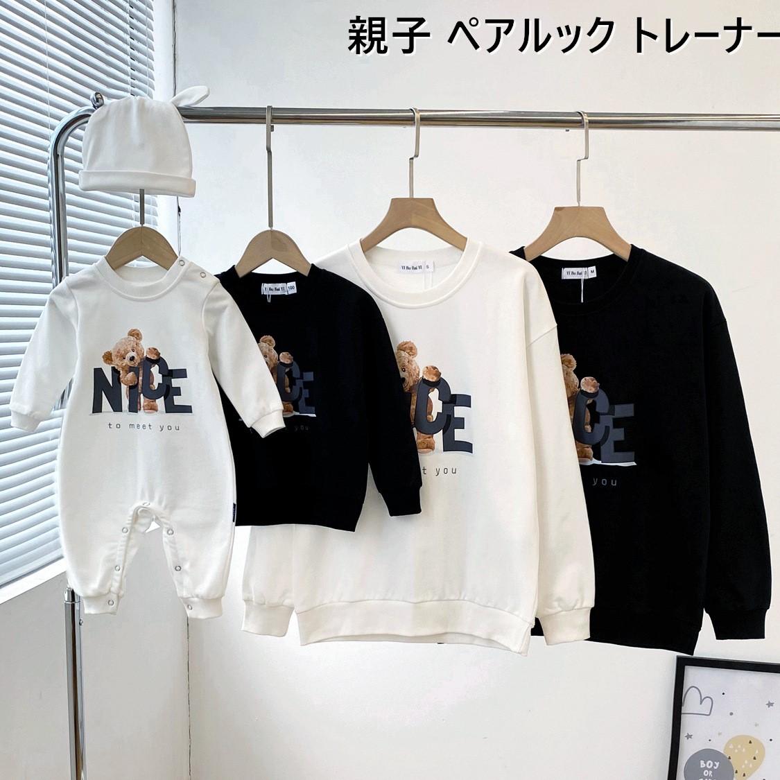 リンクコーデ 親子セット ペアルック 赤ちゃんロンパース クマちゃん長袖トップス 親子コーデ 長袖ベビー服 親子お揃い服 帽子付きペア 母娘ペアルック